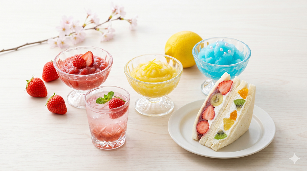 | ソーダ | グラス底にラムネあん+ソーダで、2層のクリームソーダ風。 |