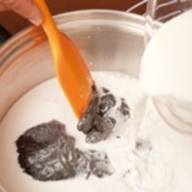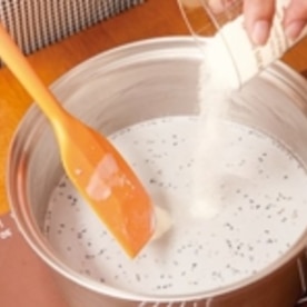 - 焙煎黒ごまあんを牛乳でとき、弱火にかけます。