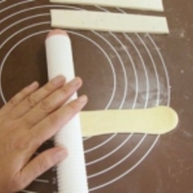 生地を30gずつ麺棒で10cm程度に伸ばします。
