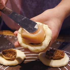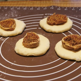 ベンチタイム終了後、手の平で軽く伸ばしドライいちじくをのせます。