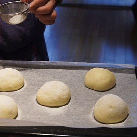 発酵終了後、綴じ目を下にして強力粉をふります。