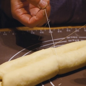 ベンチタイム終了後、生地を麺棒で長方形に伸ばします。
