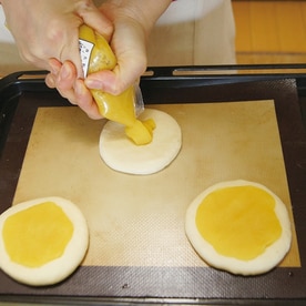 凹ませたところにスイートポテトあん45gをのせ、平らになるよう整えます。