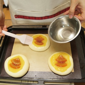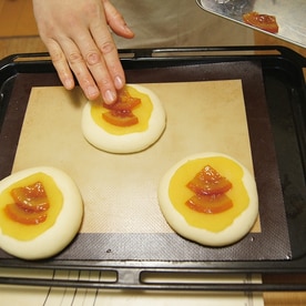 二次発酵終了後、4分の1にカットしたオレンジコンフィを2切れのせます。
