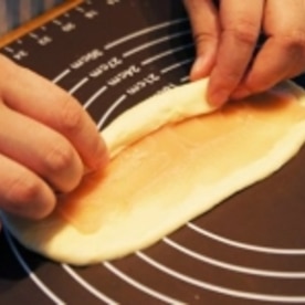 生地を長方形に伸ばし、ほんのり苺あんを端を少し残してぬります。