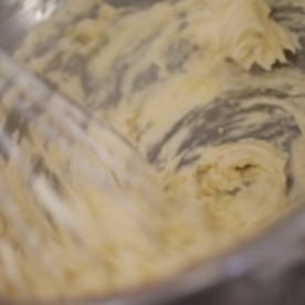 バターに砂糖を加え、泡立て器でもったりするまでよく混ぜます。
