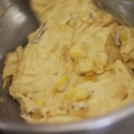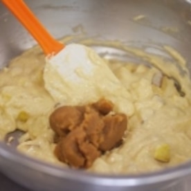 上にトッピングする用のさつまいもを取り分け、残りを入れて混ぜ込みます。