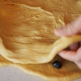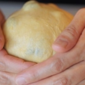 もう一度、生地の半分に鹿の子をのせて二つにたたみ、軽くボール状にします。