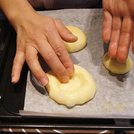 二次発酵終了後のパン生地の中央を軽くおさえて凹ませます。
