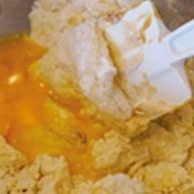 生地がまとまってきたら卵と砂糖を加え、軽く混ぜます。