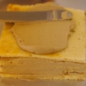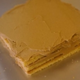 - 4枚目のビスキュイ生地にコーヒークリームを塗り、冷蔵庫で冷やして固めます。