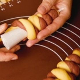 色の違う2本ずつを組み合わせ、ねじって1本にします。ころがしてやさしく細くなりすぎないようにより合わせます。
