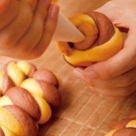 焼きあがったコルネを冷まし、冷めたところでほくほくかぼちゃあんを絞り入れます。