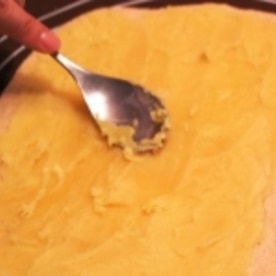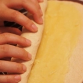 生地を四角に伸ばし、スイートポテトあんを全体に塗ります。