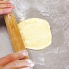 ベンチタイム終了後、麺棒を使って直径8cmの円形に伸ばします。
