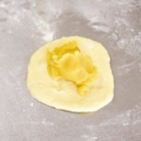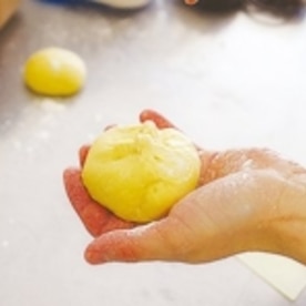 手の平に生地をおき、中央にスイートポテトあんをのせて包あんします。