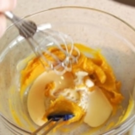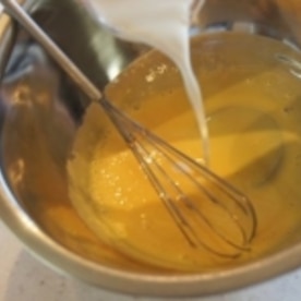 卵黄をときほぐし、そこへ牛乳と生クリームを加えます。