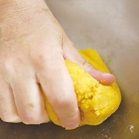 かぼちゃパウダーと薄力粉を入れ、練っていきます。