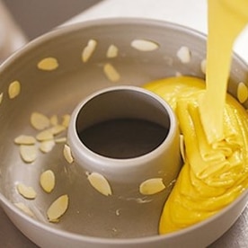 バターを型にぬり、スライスアーモンドを散らして冷蔵庫で冷やしておきます。