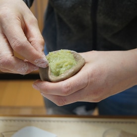 麺棒で生地を丸く伸ばし、涼味ずんだあんを包みます。