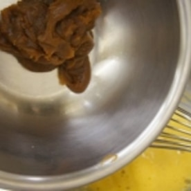 卵黄を泡立てて、人肌に温めた牛乳を加え混ぜます。