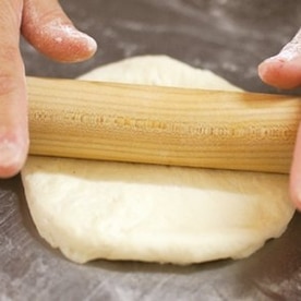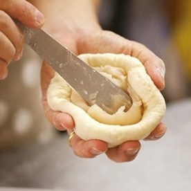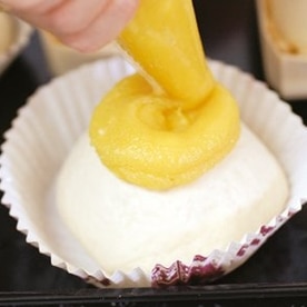 生地の中央に極上しろあんをのせ、生地で包みます。