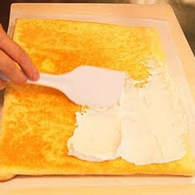 上面に巻き終わり1cm程度を残して練乳クリームを塗り広げます。