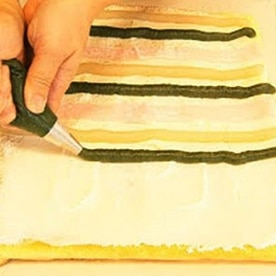 シートによもぎあんと白あんを並べて絞り、さらに求肥シートを並べて置いていきます。