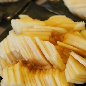紅玉りんごを2等分し、皮と種をとり除き、薄切りにします。
