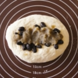 生地をやや楕円で丸くのばし、京玉露茶あんを全体にぬります。そして、黒豆鹿の子を全体にまんべんなくのせます。