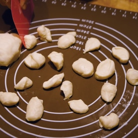 ベンチタイム終了後、ひとつひとつの生地にミックス鹿の子を適量包みます。