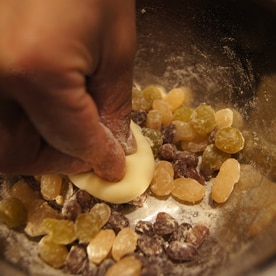 ミックス鹿の子に強力粉をまぶしておきます。