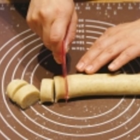 「3」のクッキー生地を1個あたり約10gの20等分に輪切りにします。