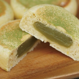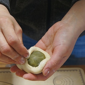 広げた生地に、抹茶あん40gを包み、あんぱんの形に成形します。