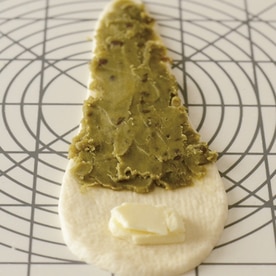 手前にバターをのせ、生地の奥側全面に抹茶小豆あんをぬり広げます。