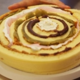スポンジを中心から同心円を描くように、3種を順番に巻いていきます。